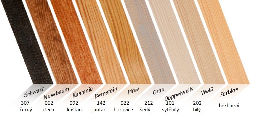 002 bezbarvý, 022 borovice, 062 ořech, 092 kaštan, 101 sytě bílý, 142 jantar, 202 bílý, 212 šedý, 307 černý.