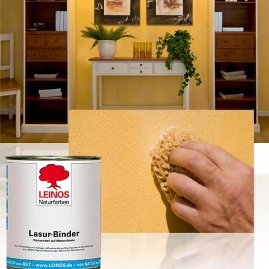 Verwirklichen Sie Ihre kreativen Wandgestaltungsideen mit dem LEINOS Lasur-Binder! In der Mischung mit den 24 LEINOS Pigment-Konzentraten sind nahezu unbegrenzte Farbvariationen und -nuancen möglich. In weiterer Kombination mit den verschiedenen Auftragstechniken (Bürste, Schwamm usw.) und Ihrer persönlichen „Handschrift“ erhält die Wandfläche ihren unverwechselbar eigenen Charakter. Obendrein ist die Handhabung so einfach, dass man kein „Profi“ sein muss, um tolle Ergebnisse zu erzielen!